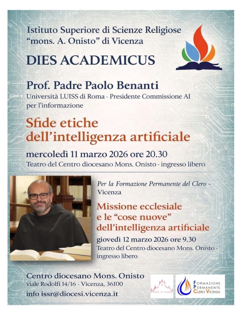 Si svolgerà mercoledì 11 marzo 2026, alle ore 20.30 nel teatro del Centro diocesano Onisto (viale Rodolfi 14/16) a Vicenza il Dies academicus dell’Istituto superiore di Scienze religiose “Mons. A. Onisto di Vicenza.